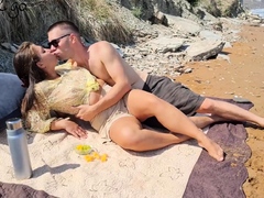 Voyeur Guy wanking and fuck redhead girl on a public beach