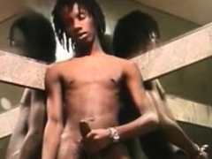 Nude lad strokes knob with both hands and enjoys the orgasm